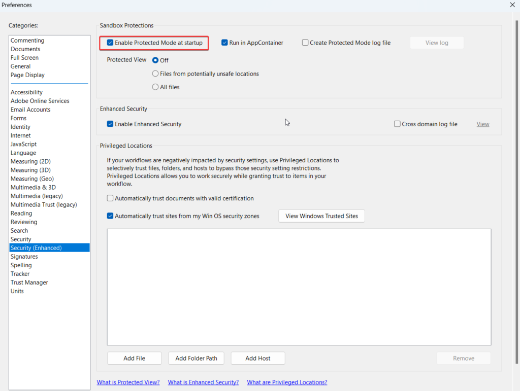 - Adobe Acrobat s'exécute en mode protégé.