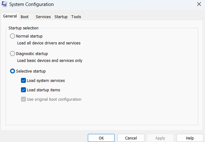 4. DésélectionnezCharger les éléments de démarrageet vérifieCharger les services système.