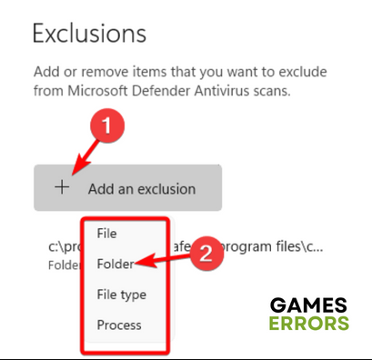 5. Cliquez sur leAjouter une exclusionbouton pour sélectionner leShooterGame.exedepuis le répertoire d’installation du jeu sur votre PC.