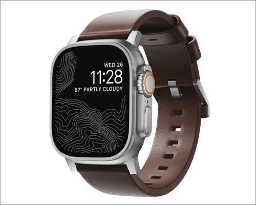 Un bracelet en cuir est un accessoire Apple Watch intemporel qui a fière allure et dure longtemps. Mon préféré est celui de NOMAD, fabriqué à partir de cuir tanné végétal peu traité. Il développe avec le temps une patine classique qui semble unique et luxueuse.
