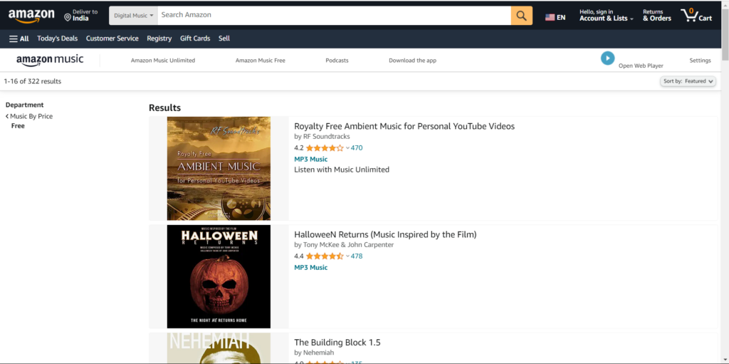 Nous ne pouvons pas oublier Amazon Music lorsqu’il s’agit de télécharger de la musique libre de droits. Amazon Music est également un excellent site de musique pour télécharger légalement et gratuitement de la musique. Il a plusieurspistes audio libres de droitsqui peut être utilisé sur YouTube ou d'autres vidéos, jeux vidéo, films et plus encore sans aucun problème.