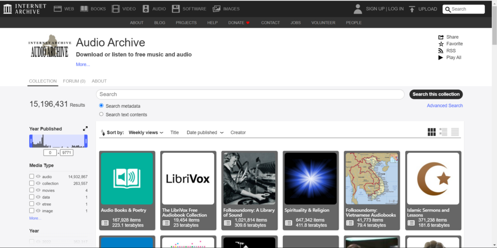 Pour être précis, il a14,7 millions d'enregistrements audio, que vous pouvez télécharger gratuitement. Vous pouvez également les diffuser sans les télécharger. Un autre avantage de ceci est que cela vous permetfiltrer le sonpar type de média, année de publication, créateur, langue et même sujet. Dans l’ensemble, c’est un excellent site de téléchargement de musique qui vous permet de télécharger facilement de la musique.