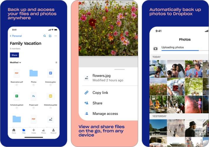 Dropbox est l'une des alternatives Google Photos les plus populaires car elle vous permet de sauvegarder et de synchroniser des photos, des vidéos, des documents et d'autres fichiers sur le stockage cloud et d'y accéder depuis n'importe quel appareil, où que vous soyez. De plus, il dispose de fonctionnalités de partage avancées mais faciles à utiliser qui facilitent l'envoi de photos ou de fichiers à votre famille, vos amis et vos collègues.