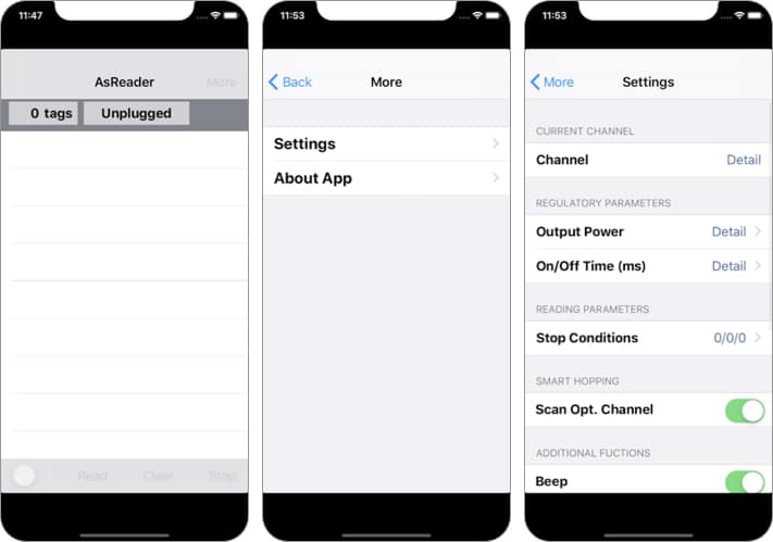 Cette application fonctionne conjointement avec RFID AsReader (ASR-030D). Il s’agit d’un lecteur monté sur boîtier connecté à l’appareil iOS via le connecteur Lightning. Il fonctionne parfaitement en vous permettant de lire les étiquettes RFID.