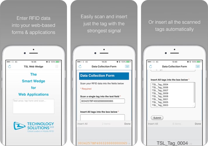 Cette application a été conçue pour numériser et saisir les balises dans différentes pages Web. Cette application est compatible avec 1128 Bluetooth UHF Rea, 1128 Bluetooth UHF RFID et 1153 Bluetooth Wearable UHF RFID Readers de TSL.