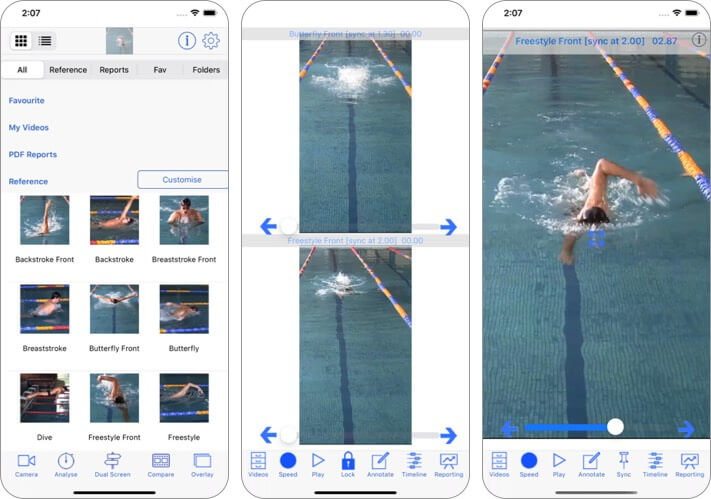 Voici une application de natation professionnelle qui vous aide à évaluer, suivre et gérer votre position corporelle hors de la piscine pour améliorer vos performances dans la piscine. Une fonctionnalité clé consiste à mesurer et à comparer les photos sur écran de natation avec un « exemple idéal ».
