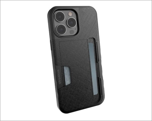 Vous disposez de trois emplacements pour cartes et d’un emplacement supplémentaire pour l’argent liquide. Il y a des lèvres surélevées sur les bords pour protéger l'écran à l'avant et un pare-chocs en caoutchouc TPE à l'arrière. De plus, il possède une doublure protectrice en microfibre et peut résister à des chutes jusqu’à 10 pieds. De plus, il est compatible avec les accessoires MagSafe et le chargement sans fil Qi.