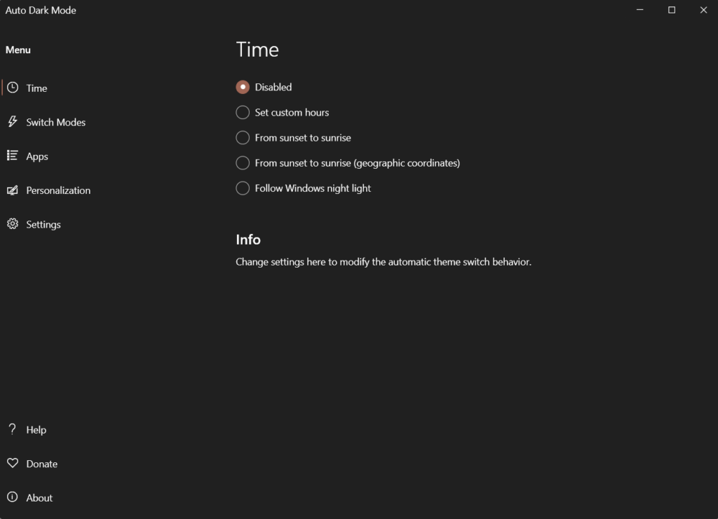 La dernière application de nos meilleures applications de personnalisation pour Windows 11 estMode sombre automatique. Mode sombre automatiqueactive/désactive automatiquement le mode sombresur votre PC Windows à l’heure spécifiée. De plus, il désactive ou active automatiquement le mode sombre du système lorsque le soleil se couche et se lève.