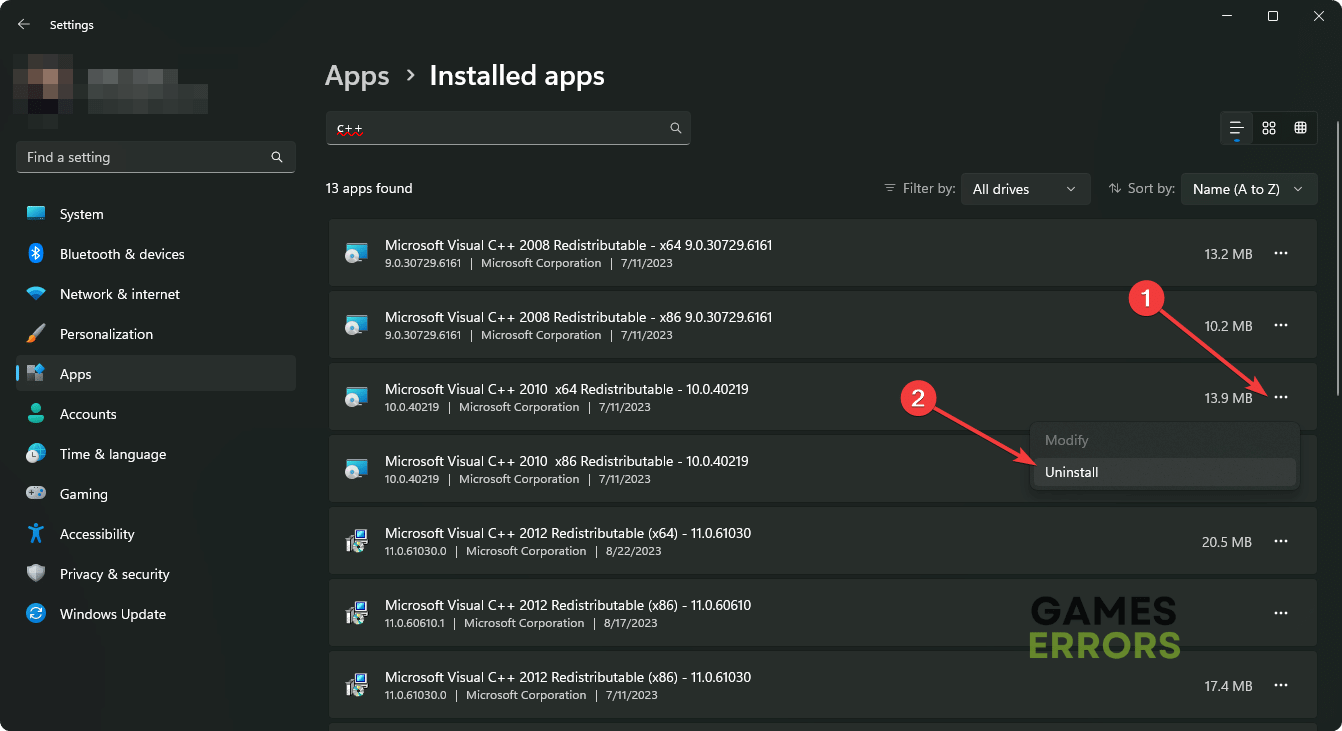 - Localisez Microsoft Visual C++, cliquez sur les trois points horizontaux à côté, puis cliquez sur Désinstaller.