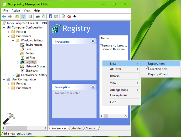 3.Cela ouvrira la fenêtre de l'éditeur de gestion des stratégies de groupe. Si la clé de registre que vous souhaitez déployer est basée sur une machine, accédez simplement à Configuration ordinateur > Préférences > Paramètres Windows > Registre. Sinon, s'il est basé sur l'utilisateur, accédez à Configuration utilisateur, Préférences et accédez au dossier Registre. Dans le volet droit du Registre, faites un clic droit et sélectionnezÉlément de registre.