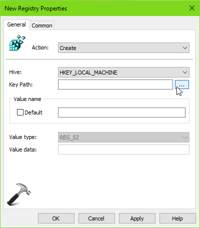4.Ensuite, sous Nouvelles propriétés du registre, sélectionnez Action commeCréerpour déployer une nouvelle clé de registre. Sélectionnez Hive, puis cliquez sur le bouton Parcourir.