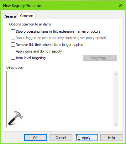 7.Sur cette fenêtre de propriétés, vous pouvez basculer vers l'onglet Commun qui permet de gérer des options supplémentaires pour cet élément de registre. Sélectionnez votre option et cliquez sur OK.