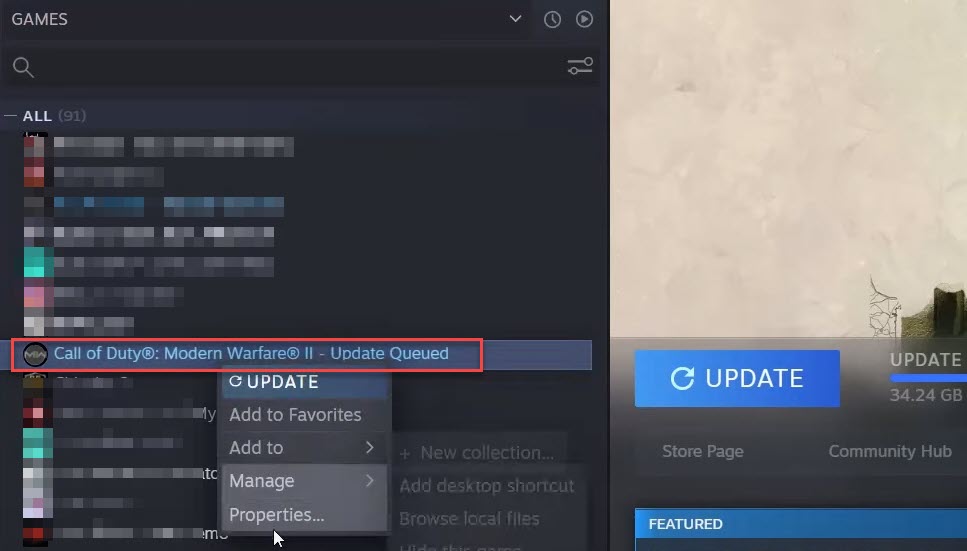 Pour définir l'obtention toujours d'une mise à jour automatique, cliquez avec le bouton droit sur le MW2 et sélectionnezPropriétés.