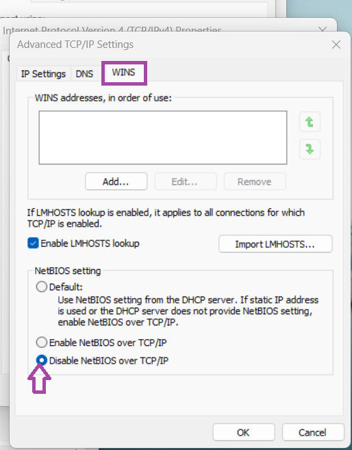 - Cliquez surAvancé>VICTOIRESonglet > cliquez sur le bouton radio deDésactiver NetBIOS sur TCP/IPet cliquezD'ACCORD.