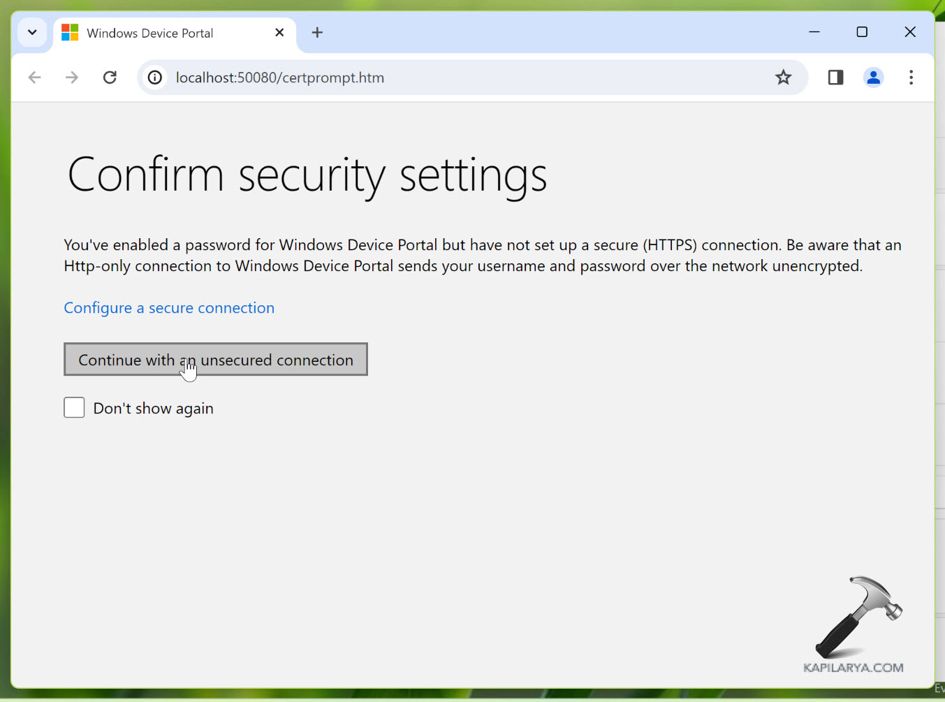 7. Essayez maintenant d'accéder à WDP en utilisant le lien localhost. Cela s'ouvrira dans un navigateur Web par défaut. Puisqu'il s'agit d'une page HTTP, certains navigateurs peuvent afficher un avertissement, mais comme il s'agit d'une page d'appareil local, vous pouvez simplement sélectionner continuer avec une connexion non sécurisée, si vous utilisez Microsoft Edge.