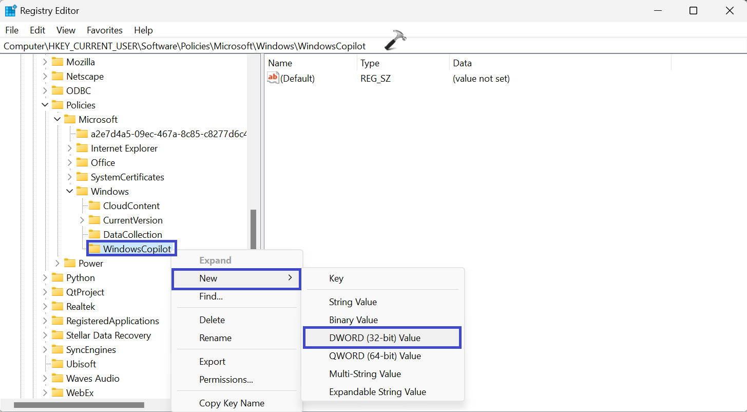 3. Ici, vous devez créer une clé de registre nommée «WindowsCopilot“.
