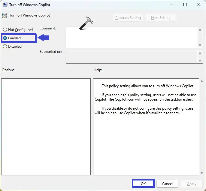 Sélectionner "Activer» pour activer le Copilot sur Windows 11, puis cliquez sur OK suivi de Appliquer.