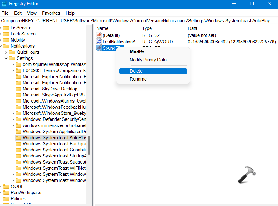Ou bien, supprimez leFichier sonREG_SZ en faisant un clic droit dessus. Cela activera les sons de notification pour cet expéditeur spécifique.