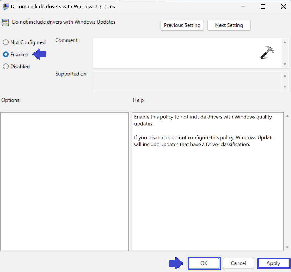 Sélectionnez « Activé » pour activer « Ne pas inclure le pilote avec Windows Update ».