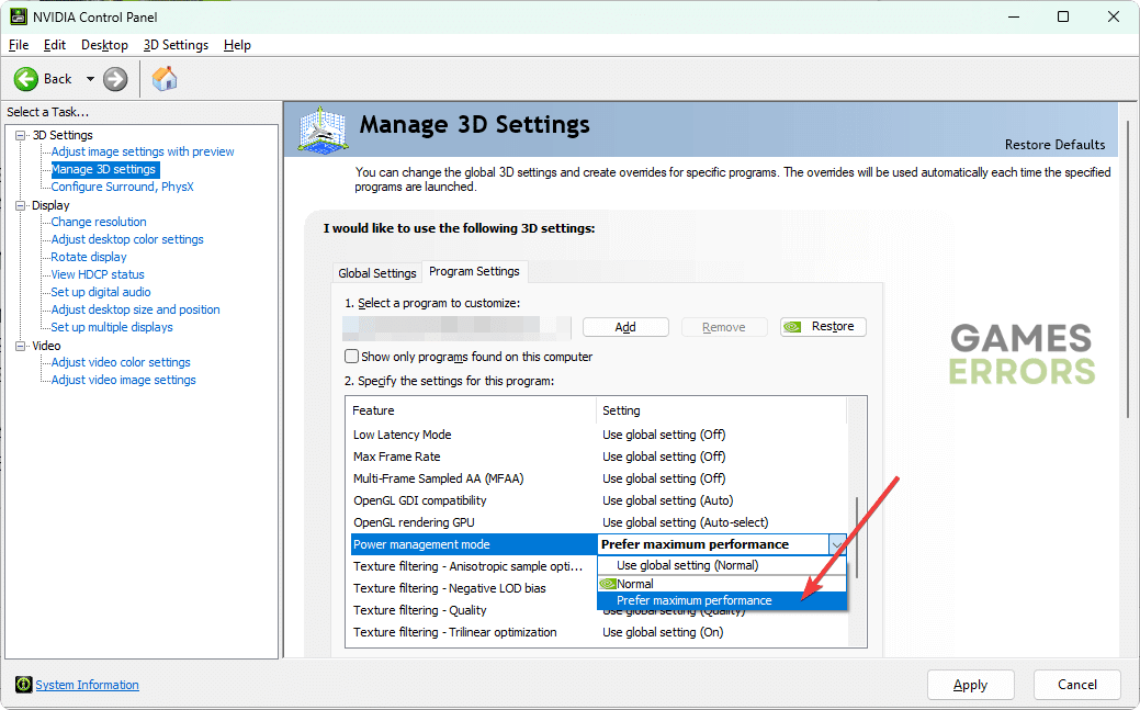 - Accédez auGérer les paramètres 3Det cliquez surParamètres du programme.