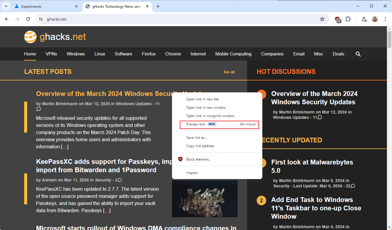 La fonctionnalité d'aperçu des liens est activée par défaut dans les versions Canary du navigateur Web Google Chrome. Si vous l'utilisez, vous devriez pouvoir maintenir la touche Alt enfoncée et cliquer sur un lien ou survoler celui-ci pour le prévisualiser. L'option de clic droit est également disponible si vous la préférez.