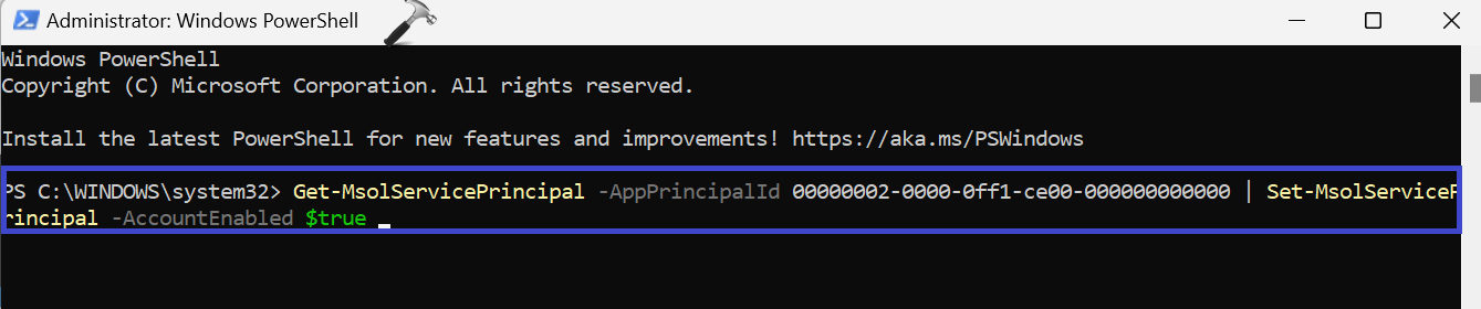 # Enable the application Get-MsolServicePrincipal -AppPrincipalId 00000002-0000-0ff1-ce00-000000000000 | Set-MsolServicePrincipal -AccountEnabled $true