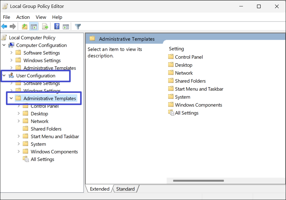 2. Une fois l'éditeur de stratégie de groupe local ouvert, développez «Modèles d'administration" sous "Configuration utilisateur ».