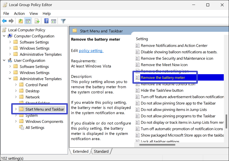 3. Dans le panneau de gauche, sélectionnez «Menu Démarrer et barre des tâches", puis faites défiler le panneau de droite et double-cliquez sur "Retirez le compteur de batterie" option.