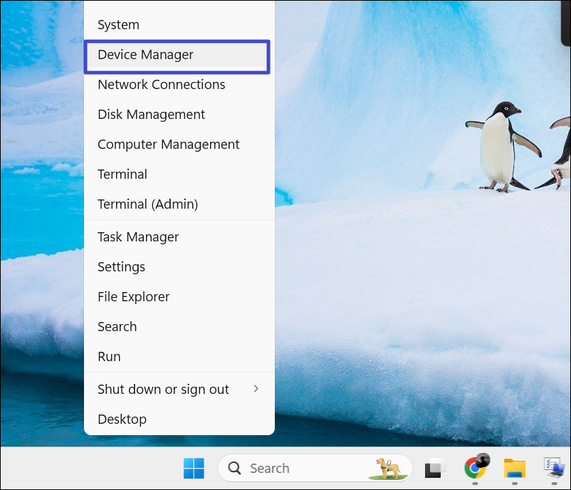 1. Cliquez avec le bouton droit sur le menu Démarrer et sélectionnez «Gestionnaire de périphériques» dans le menu contextuel.