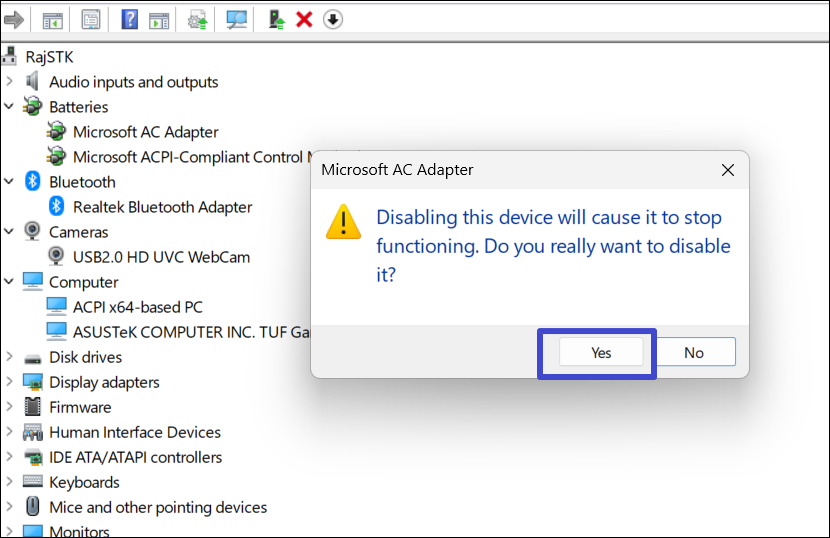 4. Cliquez avec le bouton droit sur «Adaptateur secteur Microsoft »appareil et sélectionnez «Désactiver l'appareil“.
