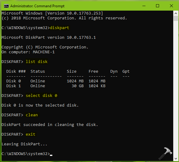 exit Exit from DiskPart tool