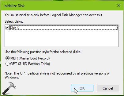 3.Vous pouvez maintenant fermerInvite de commandeet ouvrez le composant logiciel enfichable Gestion des disques. Il vous sera maintenant directement demandé d'initialiser le disque comme indiqué ci-dessous. Vous pouvez désormais également initialiser manuellement le disque, en faisant un clic droit sur le disque et en sélectionnantInitialiser le disqueoption.