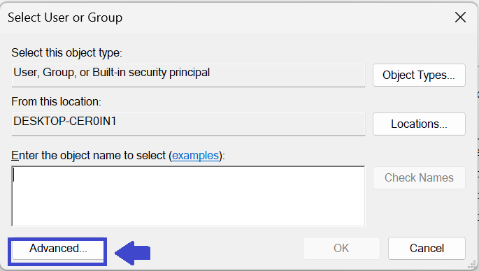 5. Dans la fenêtre Sélectionner un utilisateur ou un groupe, cliquez sur le bouton Avancé.