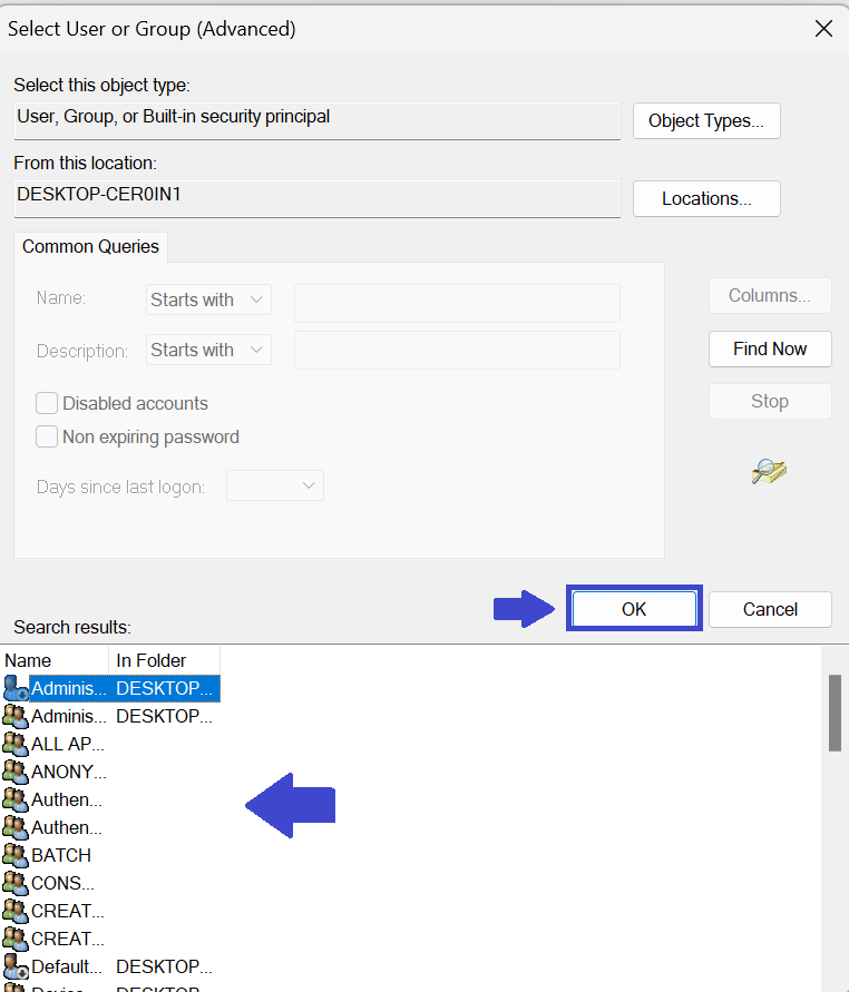 7. Dans les résultats de recherche affichés ci-dessous, recherchez votre nom dans la liste et sélectionnez-le. Cliquez sur OK. De retour dans la fenêtre Sélectionner un utilisateur ou un groupe, cliquez sur OK pour confirmer le nom de l'objet.