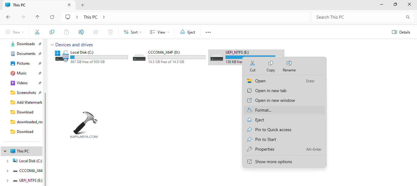 Étape 3-Insérez la clé USB. Ouvrez l'Explorateur de fichiers. Cliquez maintenant sur Ce PC sur le côté gauche qui affichera la clé USB sur le côté droit.
