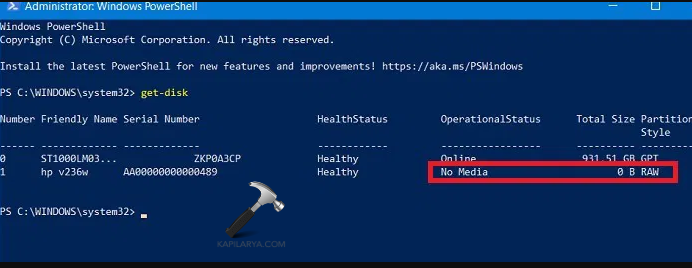 Étape 2-Localisez maintenant la clé USB et vérifiez que son état de santé est « sain » et que son état opérationnel est « aucun média ». L’existence des deux impliquait que la clé USB soit amorçable.