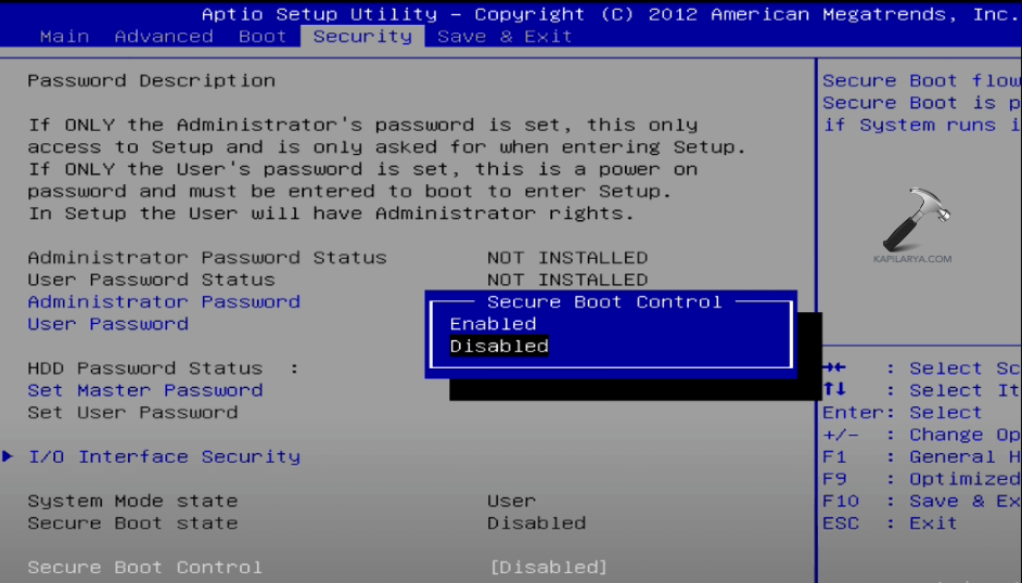 Étape 2-Deuxièmement, accédez à Sécurité > Contrôle de démarrage sécurisé. De plus, désactivez l’option Secure Boot Control.