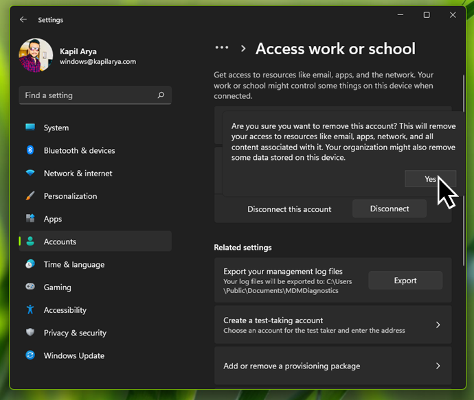 Voir aussi :Déconnectez Windows 11 du compte professionnel ou scolaire