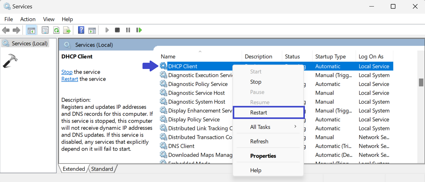 Si la carte réseau ou le service client DHCP ne fonctionne pas, votre ordinateur ne pourra pas se connecter à Internet. Pour résoudre ce problème, vous pouvez essayer de redémarrer la carte réseau et le service client DHCP.