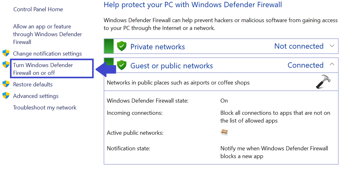 Sous Paramètres du réseau public, sélectionnez «Désactivez le pare-feu Windows Defender (non recommandé)“.
