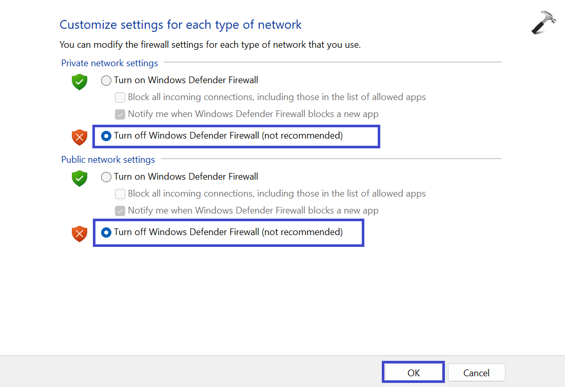 4. Sous Paramètres du réseau privé, sélectionnez «Désactivez le pare-feu Windows Defender (non recommandé)“.