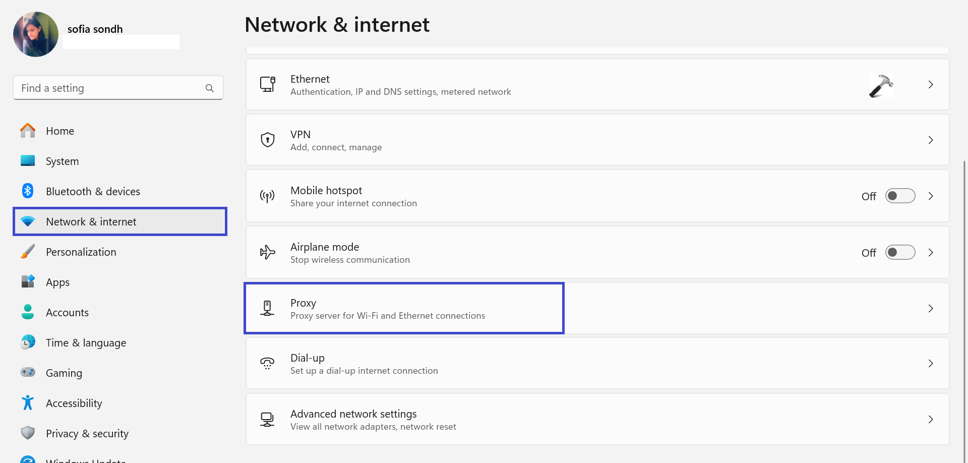 2. Allez dans «Réseau & Internet» et sélectionnez «Procuration“.