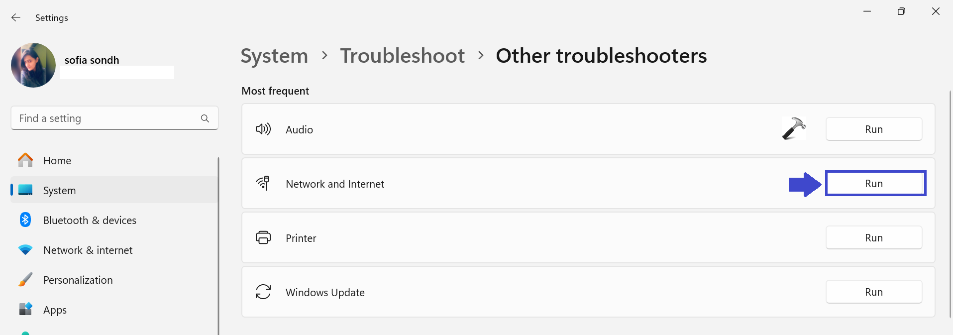 4. Maintenant, cliquez sur «Courir" à côté du "Réseau et Internet" option.