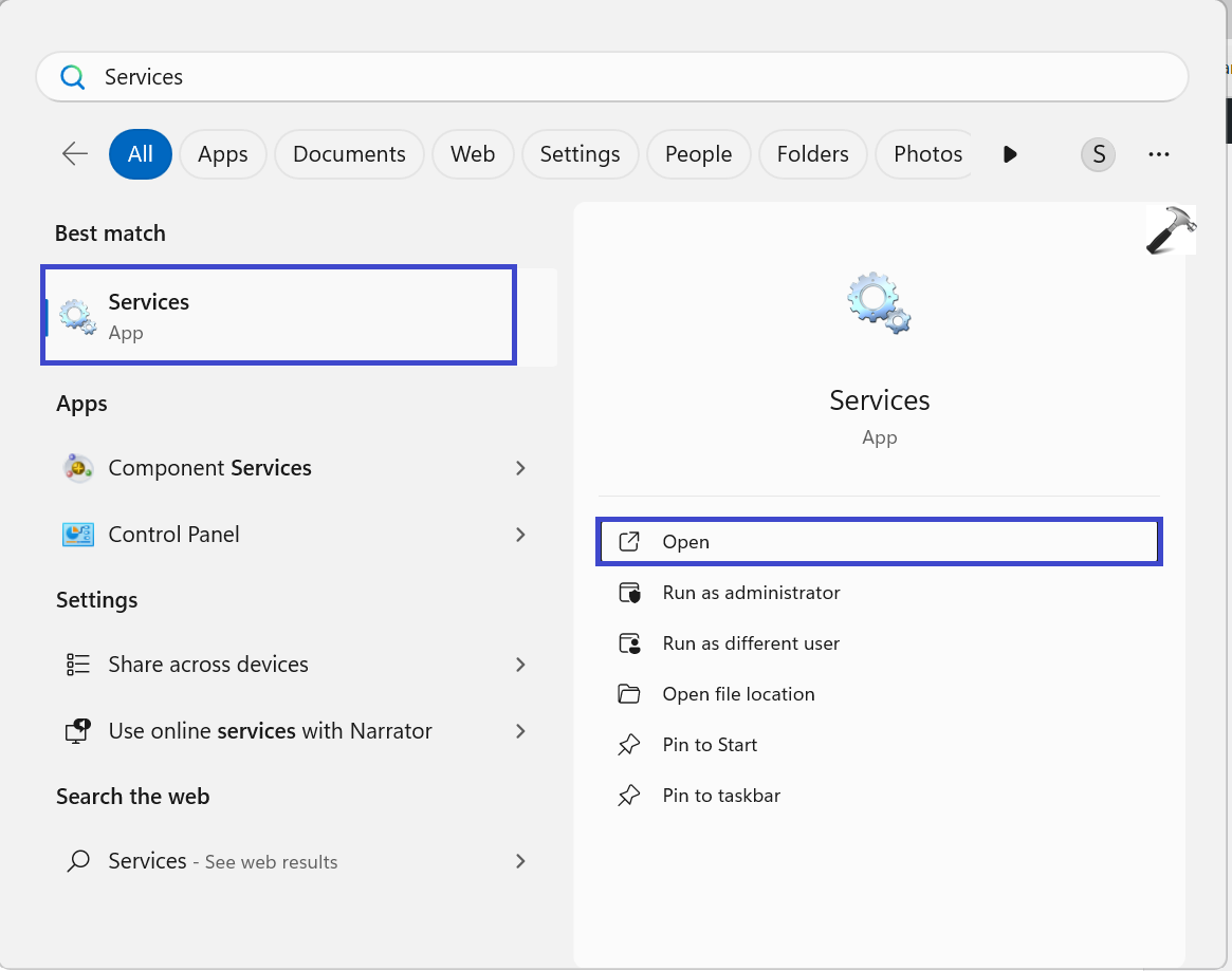 1. Ouvrez la barre de recherche, tapez « Services » puis cliquez sur «Services“.