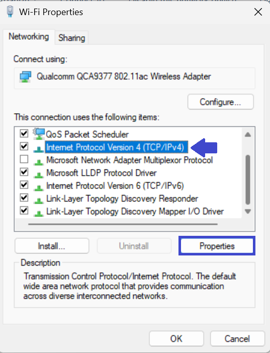 4. Sélectionnez le «Protocole Internet version 4 (TCP/IPv4)» et sélectionnez «Propriétés“.