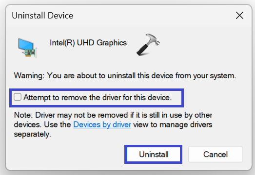 4. Une boîte de dialogue apparaîtra. Vérifiez le "Tentative de suppression du pilote de ce périphérique" boîte.