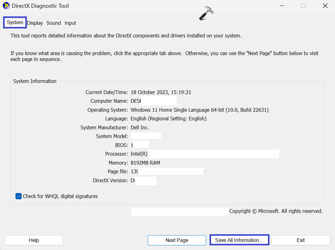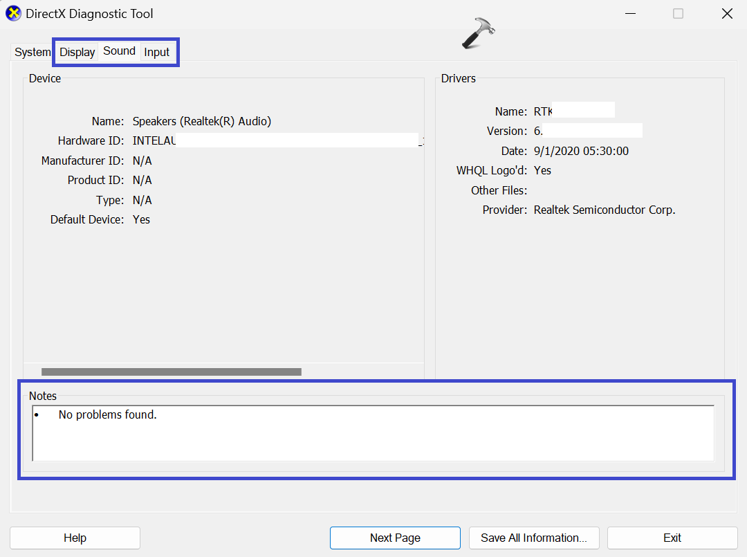4. Maintenant, accédez auAfficher,Son, et jenentréeonglets un par un pour rechercher tout problème détecté par l'outil de diagnostic DirectX.