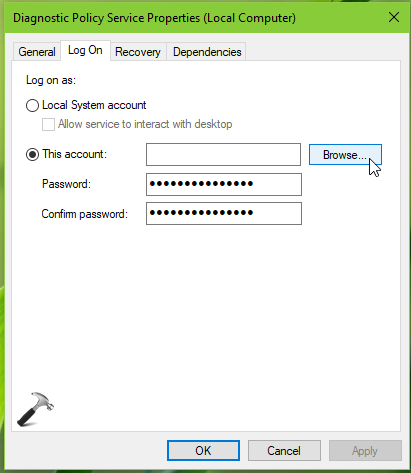7.De retour à la feuille de propriétés du service, étant donné que le service local est maintenant ajouté, assurez-vous de laisser les champs Mot de passe et Confirmer le mot de passe vides. CliquezAppliquer,D'ACCORD.