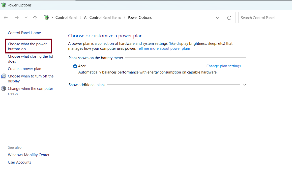 2. Cliquez ensuite sur l'option « Choisir l'action du bouton d'alimentation » sur le côté gauche de la fenêtre Options d'alimentation.
