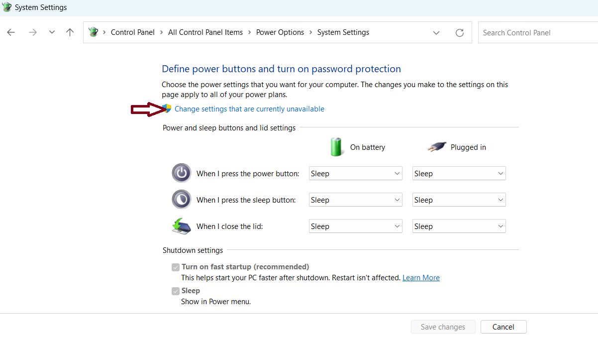 4. Cliquez sur « Modifier les paramètres actuellement indisponibles » s'il n'est pas activé. Cela rendra les champs des « Paramètres d’arrêt » actifs. Vous pouvez maintenant cocher la case à côté de « Activer le démarrage rapide (recommandé) ».